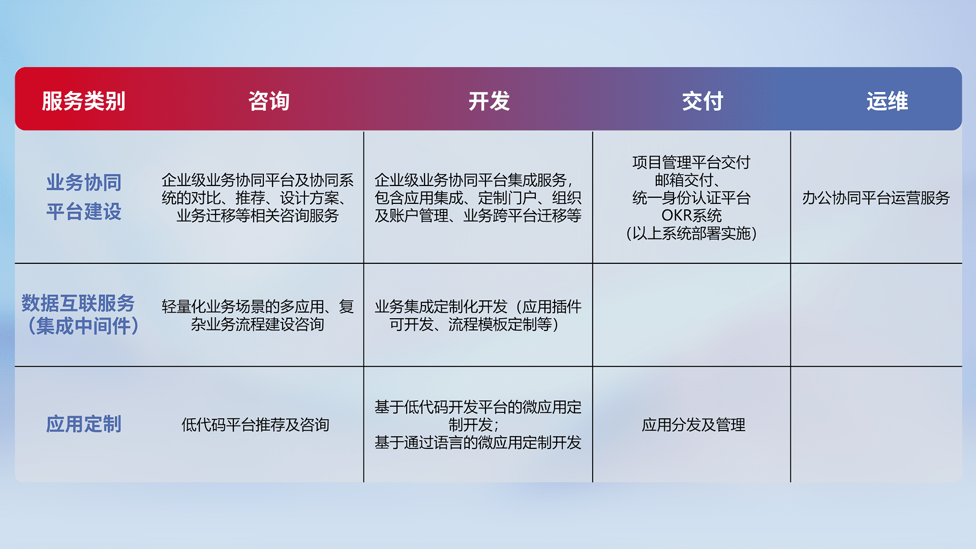 针对钉钉、、、、企微、、IDaas等平台级产品提供产品的规划、、、、方案、、、、交付、、、、定制化开发等服务,,,,实现如统一协同办公、、、、智能客户服务、、混合会议管理、、、、智能数据查询、、、等业务场景,,实现数字化转型。。。