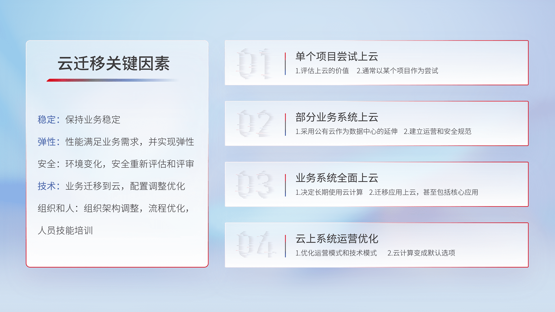 结合实际业务,,从规划设计、、、云平台选型、、、、云原生改造、、数据迁移、、、、集成交付,,迁移全过程为客户识别最佳上云路径,,,做好风险识别管理,,设计网络架构、、、身份权限、、、安全审计合规、、、、操作审计、、、日志审计、、、监控告警策略、、、、多站点容灾设计等,,对云上基础设施进行整体规划,,,,提升IT治理水平,,以满足弹性、、、高可用、、高性能的需求。。。。