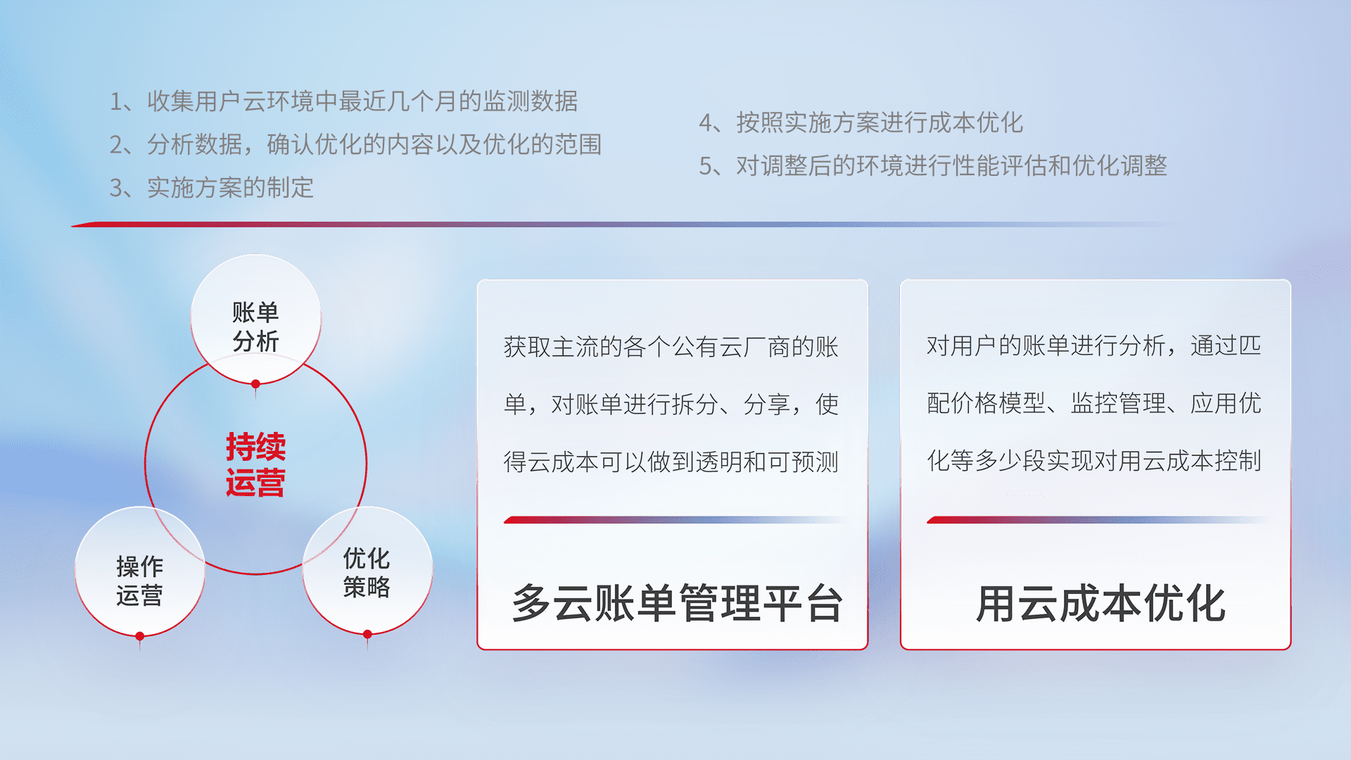 通过多云纳管,,,以统一的资源数据模型把客户的云资源进行抽象和封装,,进而实现对多云资源的统一操作,,,,保障云资源管理的可靠性、、稳定性与可用性。。量身定制化运维内容,,,配置、、、开发运维、、、、补丁管理、、备份、、、监控、、、认证和访问管理、、、审计和日常巡检等,,,保障在用云过程中的可靠度,,,稳定度以及高可用率。。。